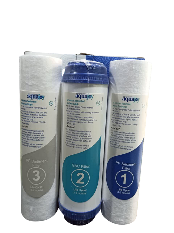 این مجموعه شامل سه عدد فیلترهای پیش تصفیه مخصوص دستگاه های تصفیه آب می باشد. این فیلتر ها مناسب برای کلیه دستگاه های تصفیه آب بوده و شامل مراحل 1 و 2 و 3 شامل فیلتر پلی پروپیلن PP پنج میکرون، و فیلتر کربن پودری UDF صددرصد گیاهی کوکونات و فیلتر پلی پروپیلن PP یک میکرون می باشد. این مجموعه سه عددی کاملا گیاهی بوده و از بهترین متریال های فود گرید ساخته شده است. پک کامل فیلتر تصفیه آب آکواجوی شامل فیلتر مرحله اول از جنس الیافی 5 میکرون و فیلتر مرحله دوم از جنس کربن پودری و فیلتر مرحله سوم از جنس الیافی 1 میکرون می باشد.